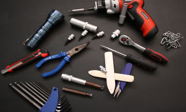 Časť nástrojov používaných k rozoberaniu a skladaniu interiérov automobilov pri montáži poťahov.
